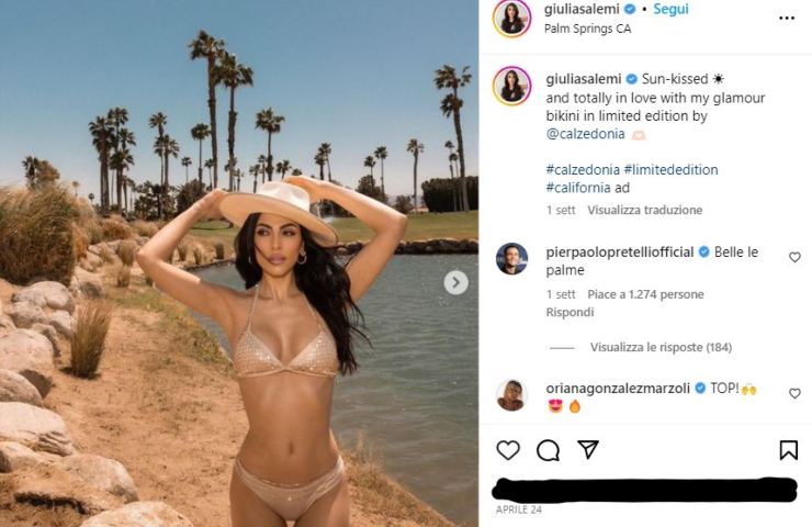 Tramite un recente post sul suo profilo Instagram Giulia Salemi ha deciso di mostrarsi direttamente come modella, posando con un nuovo bikini color oro prodotto in limited edition da Calzedonia; il noto brand di intimo femminile ha scelto la modella piacentina come testimonial e, a quanto si vede, la scelta è risultata davvero azzeccatissima.