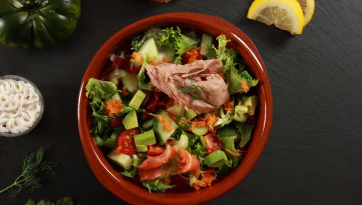 - Ora non ti resta che assemblare l’insalata, prendi la ciotola dove hai messo l’avocado e aggiungi le verdure insieme al tonno. Amalgama per bene con l’aiuto di una forchetta, aggiungi un cucchiaino di olio, i crostini o le fette di pane e la tua insalata anticaldo è pronta!